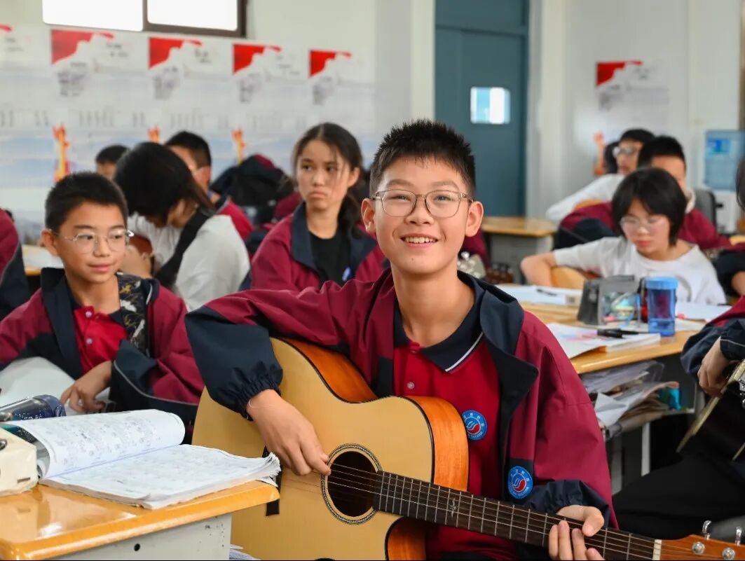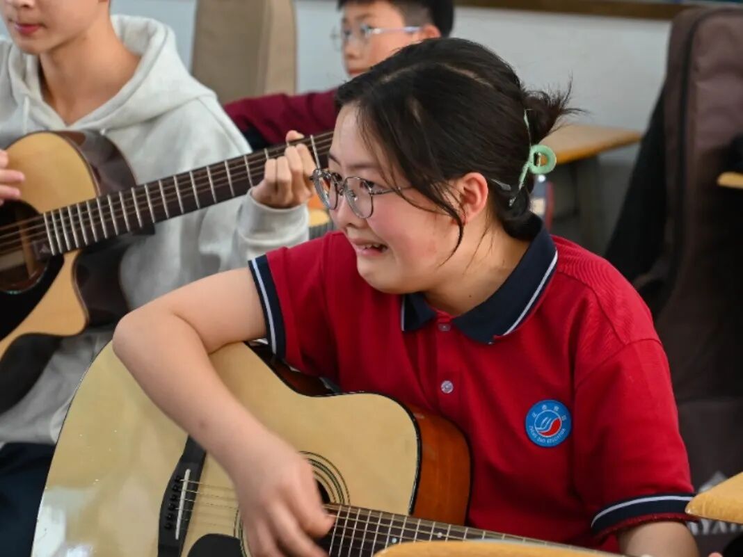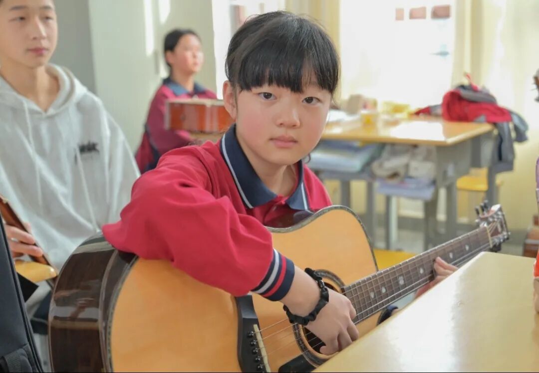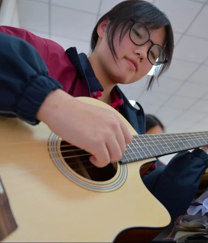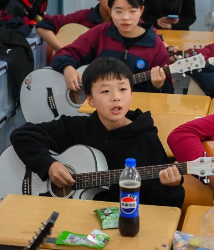一群初一的孩子们,因为热爱音乐,因为喜欢吉他而聚在这间教室里,也许他们基础薄弱,但名为热爱的力量会让他们在音乐的路上每一步路都走得格外有力。稚嫩的脸庞,小小的身躯与硕大的吉他显得不是那么搭配,但从他们坚毅的目光中依旧能清晰的看到他们未来在舞台上表演的身影。
