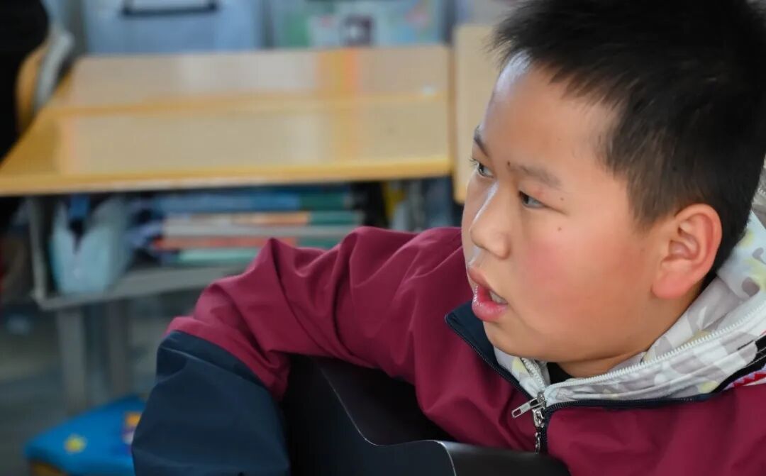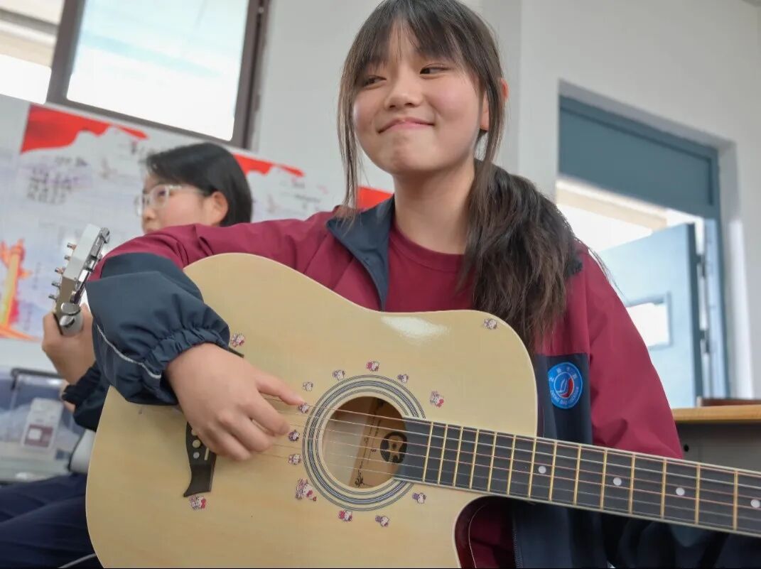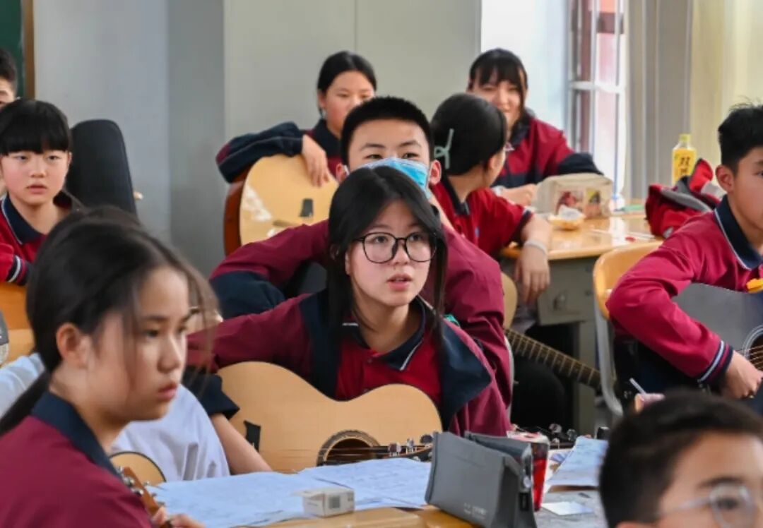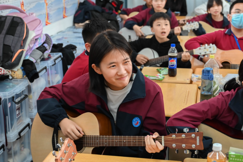 一群初一的孩子们,因为热爱音乐,因为喜欢吉他而聚在这间教室里,也许他们基础薄弱,但名为热爱的力量会让他们在音乐的路上每一步路都走得格外有力。稚嫩的脸庞,小小的身躯与硕大的吉他显得不是那么搭配,但从他们坚毅的目光中依旧能清晰的看到他们未来在舞台上表演的身影。